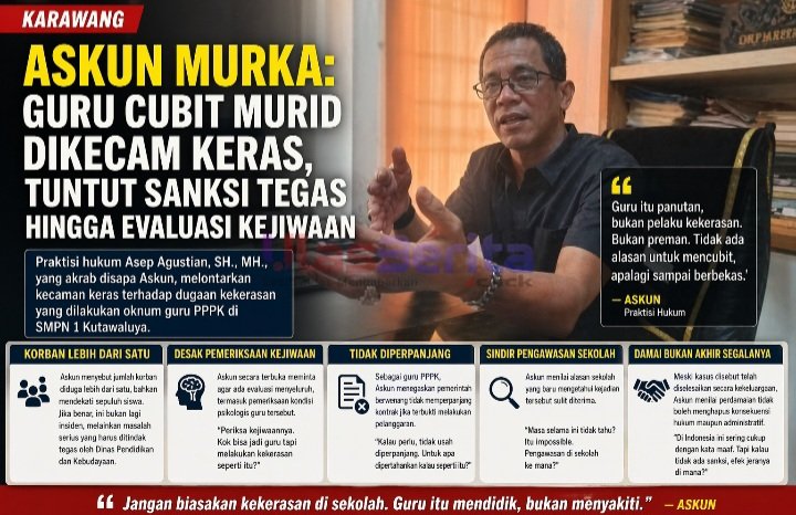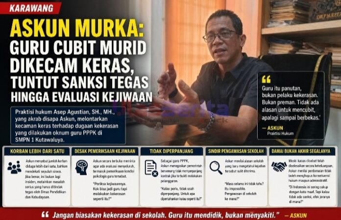 Karawang – Gelombang kritik terhadap dugaan kekerasan di SMP Negeri 1 Kutawaluya kian membesar. Kali ini datang dari praktisi hukum Asep Agustian, SH., MH., yang akrab disapa Askun. Ia melontarkan kecaman keras terhadap tindakan guru berstatus PPPK yang mencubit sejumlah siswa hingga menimbulkan bekas.