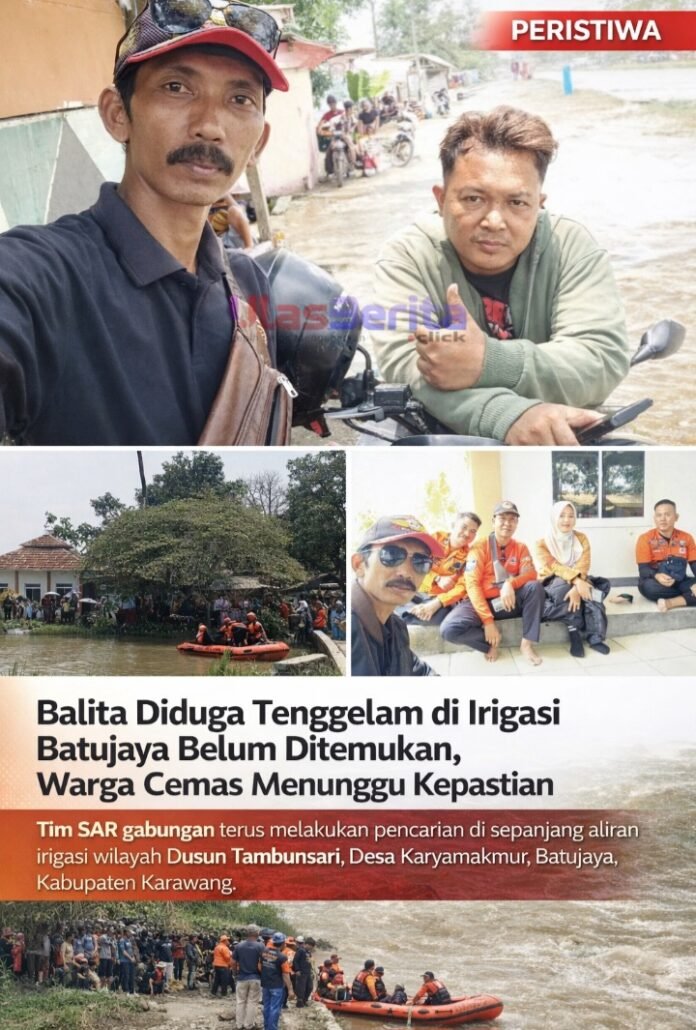 KARAWANG – Upaya pencarian seorang anak balita berusia sekitar dua tahun yang diduga tenggelam di saluran irigasi wilayah Dusun Tambunsari, Desa Karyamakmur, Kecamatan Batujaya, Kabupaten Karawang, hingga kini masih belum membuahkan hasil. Peristiwa ini menyita perhatian warga dan memicu keprihatinan luas di masyarakat.