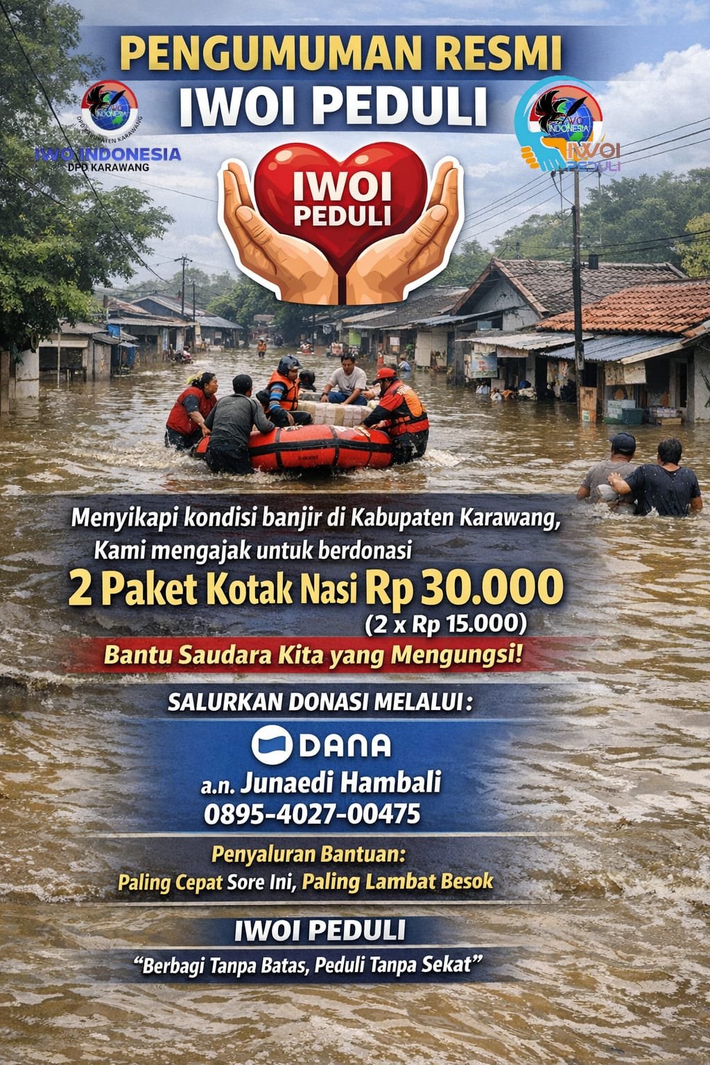 “Setiap paket nasi yang disumbangkan sangat berarti bagi saudara-saudara kita yang terdampak banjir,” demikian ajakan dari IWOI Peduli.