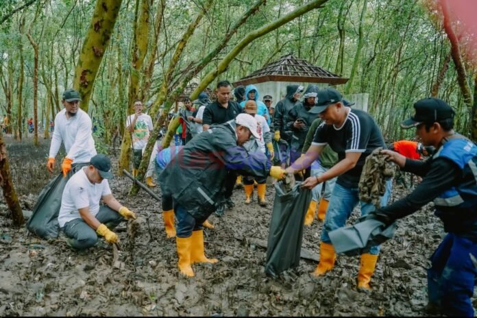 Karawang — Pemandangan tak biasa terlihat di kawasan Ekowisata Mangrove Dusun Tangkolak, Desa Sukakerta, Kecamatan Cilamaya Wetan, Sabtu (7/2/2026). Di tengah guyuran hujan, Bupati Karawang H. Aep Syaepuloh, SE., bersama jajaran Forum Koordinasi Pimpinan Daerah (Forkopimda) turun langsung memunguti sampah di kawasan pesisir.