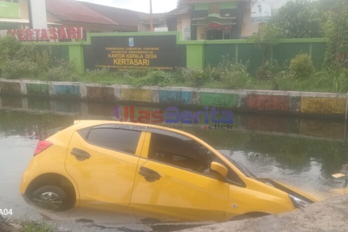 Usai menabrak korban, pengemudi mobil diduga panik dan berusaha melarikan diri. Namun nahas, kendaraan justru banting setir ke arah kiri hingga akhirnya terjun ke saluran Kali Apur, tepat di depan Kantor Desa Kertasari.