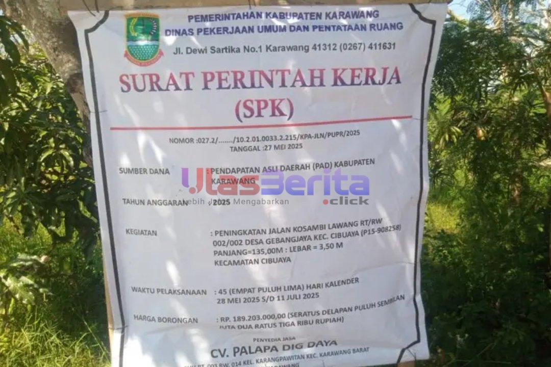 KARAWANG | ULASBERITA.CLICK | Proyek peningkatan jalan Kosambi Lawang di Desa Gebangjaya, Kecamatan Cibuaya, Kabupaten Karawang, Jawa Barat, menuai sorotan warga setempat. Berdasarkan dokumen Surat Perintah Kerja (SPK) dari Dinas Pekerjaan Umum dan Penataan Ruang Kabupaten Karawang tertanggal 27 Mei 2025, proyek ini didanai dari Pendapatan Asli Daerah (PAD) dengan nilai Rp 189.203.000 dan masa pelaksanaan selama 45 hari kalender.