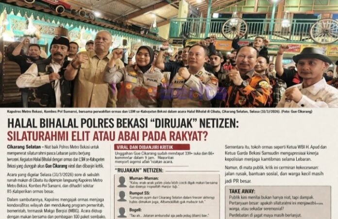 Bekasi – Niat baik Polres Metro Bekasi untuk merajut silaturahmi pasca Lebaran justru berujung kontroversi. Kegiatan Halal Bihalal bersama puluhan organisasi masyarakat (ormas) dan LSM se-Kabupaten Bekasi yang digelar Selasa (31/3/2026) sore di kawasan Cibatu, Cikarang Selatan, viral di media sosial, bukan karena pujian, melainkan banjir kritik tajam dari publik.