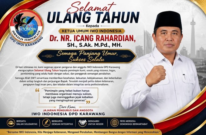 Karawang – Suasana penuh rasa hormat dan kebanggaan menyelimuti jajaran pengurus serta anggota Ikatan Wartawan Online Indonesia (IWOI) Dewan Pimpinan Daerah (DPD) Kabupaten Karawang dalam momentum peringatan hari ulang tahun Ketua Umum IWO Indonesia, Dr. NR. Icang Rahardian, yang jatuh pada 20 April 2026.