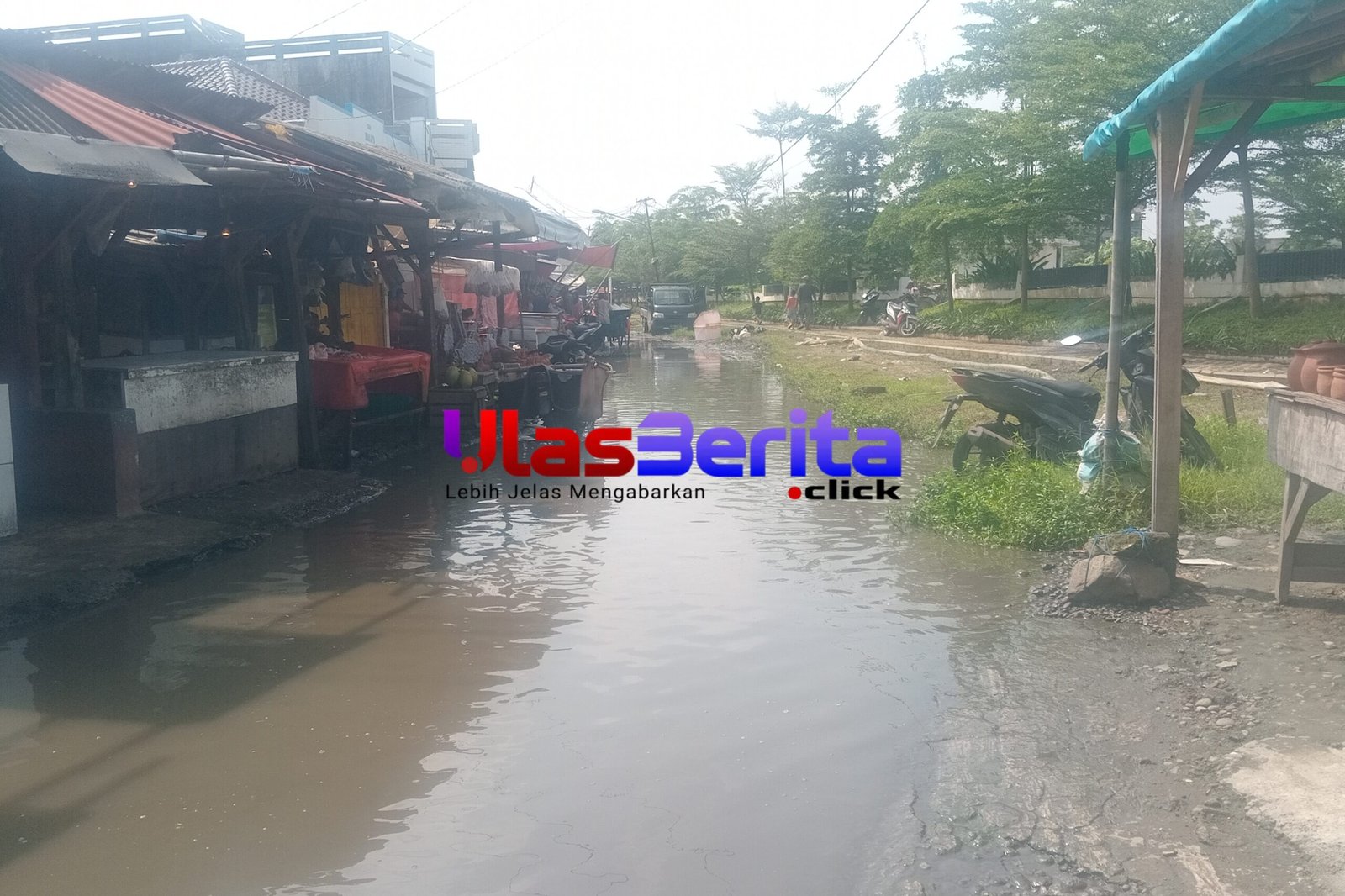 KARAWANG | ULASBERITA.CLICK | Kondisi jalan di sekitar Pasar Rengasdengklok, Kabupaten Karawang, Jawa Barat, memprihatinkan. Genangan air yang cukup tinggi menutupi sebagian besar badan jalan, mengganggu aktivitas pedagang dan pembeli yang beraktivitas di pasar tersebut.