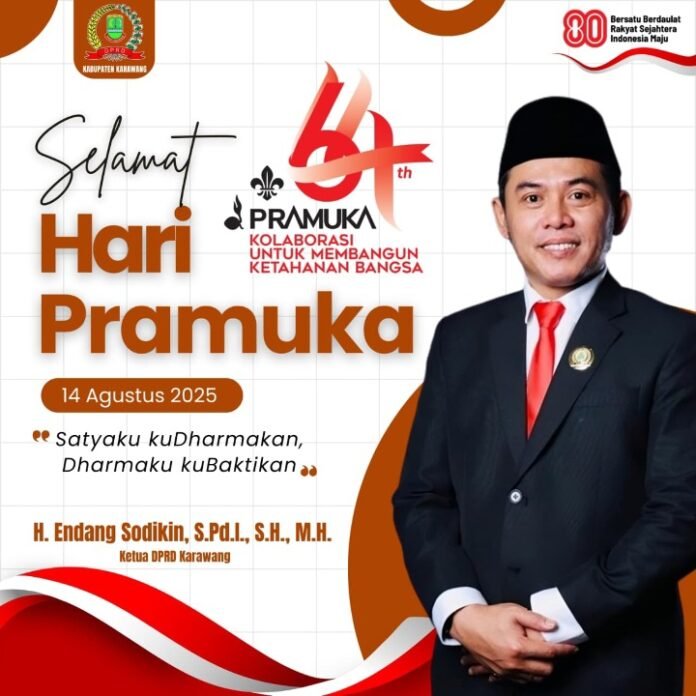 Karawang – Suasana peringatan Hari Pramuka ke-64 pada 14 Agustus 2025 menjadi momen istimewa bagi Ketua DPRD Kabupaten Karawang, H. Endang Sodiqin, S.Pd.I., S.H., M.H. Dalam pesannya, Endang menekankan pentingnya menghidupkan tema nasional “Kolaborasi untuk Membangun Ketahanan Bangsa” sebagai panduan sikap dan tindakan seluruh anggota Pramuka di era penuh tantangan ini.