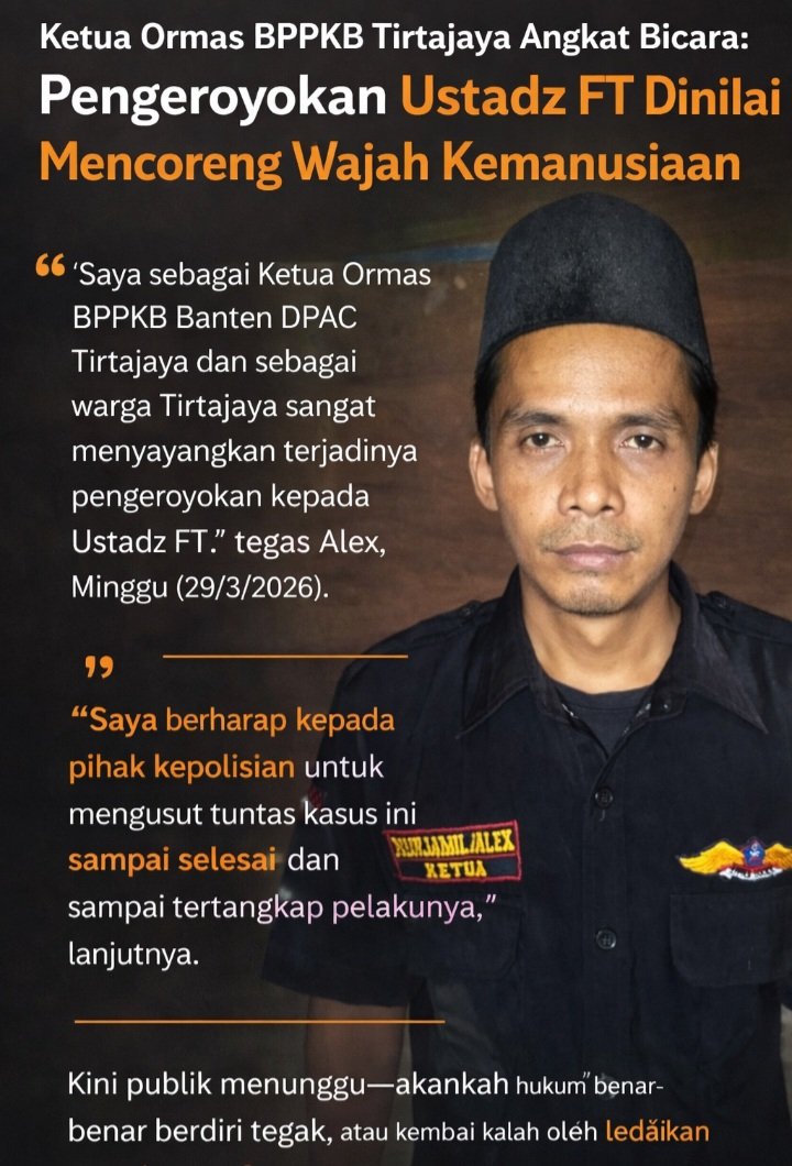 “Saya sebagai Ketua Ormas BPPKB Banten DPAC Tirtajaya dan sebagai warga Tirtajaya sangat menyayangkan terjadinya pengeroyokan kepada Ustadz FT,” tegas Alex, Minggu (29/3/2026).