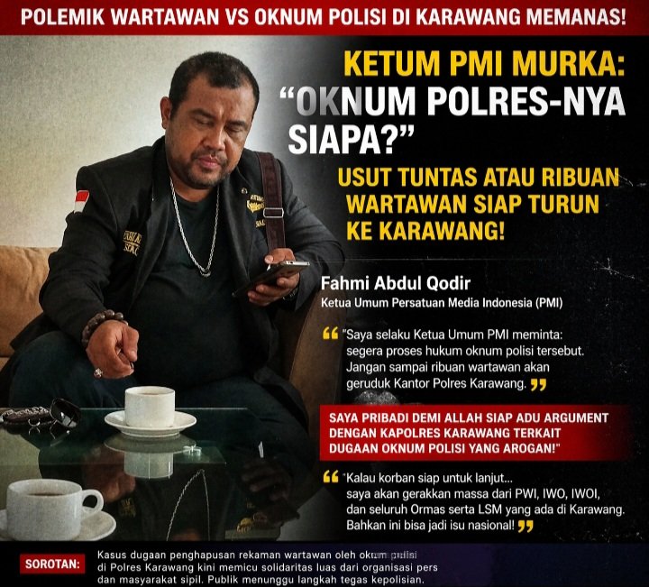 Karawang — Polemik dugaan tindakan arogan terhadap wartawan berinisial AN kini memicu reaksi keras dari kalangan organisasi pers. Ketua Umum Persatuan Media Indonesia (PMI), Fahmi Abdul Qodir, secara terbuka angkat bicara dan mendesak pengusutan tuntas terhadap oknum aparat yang diduga terlibat.