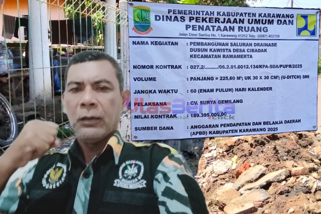 KARAWANG | ULASBERITA.CLICK | Polemik proyek saluran drainase (U-Ditch) di Dusun Kawista, Desa Cibadak, Kecamatan Rawamerta, Kabupaten Karawang, kian memanas. Ketua LSM Gerakan Masyarakat Bawah Indonesia (GMBI) KSM Rawamerta, Jajat Sudrajat alias Oblang, angkat bicara keras menanggapi pemasangan papan proyek yang baru muncul setelah proyek ini ramai diberitakan media online.