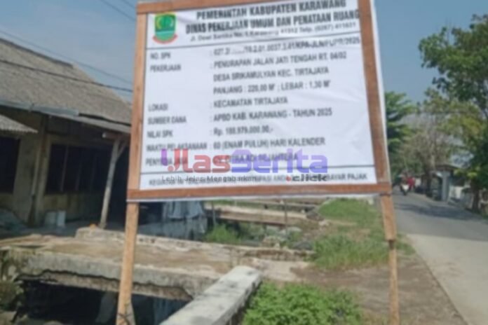 KARAWANG | ULASBERITA.CLICK | Proyek penurapan Jalan Jati Tengah RT 04/02, Desa Srikamulyan, Kecamatan Tirtajaya, Kabupaten Karawang, Jawa Barat, yang dikerjakan oleh CV. Citra Adi Sejahtera dengan anggaran senilai Rp188.979.000 dari APBD Karawang Tahun 2025 menuai sorotan tajam dari warga dan pemerhati pembangunan infrastruktur.