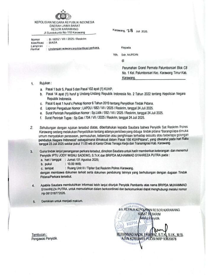 Proses klarifikasi dijadwalkan berlangsung pada Jumat, 1 Agustus 2025, pukul 10.00 WIB, bertempat di Ruang Unit III / Tipidter Satreskrim Polres Karawang. Pemeriksaan akan dilakukan oleh penyidik IPTU Judy Wisnu Sadewo, S.Tr.K dan BRIPDA Muhammad Syahreza Putra.