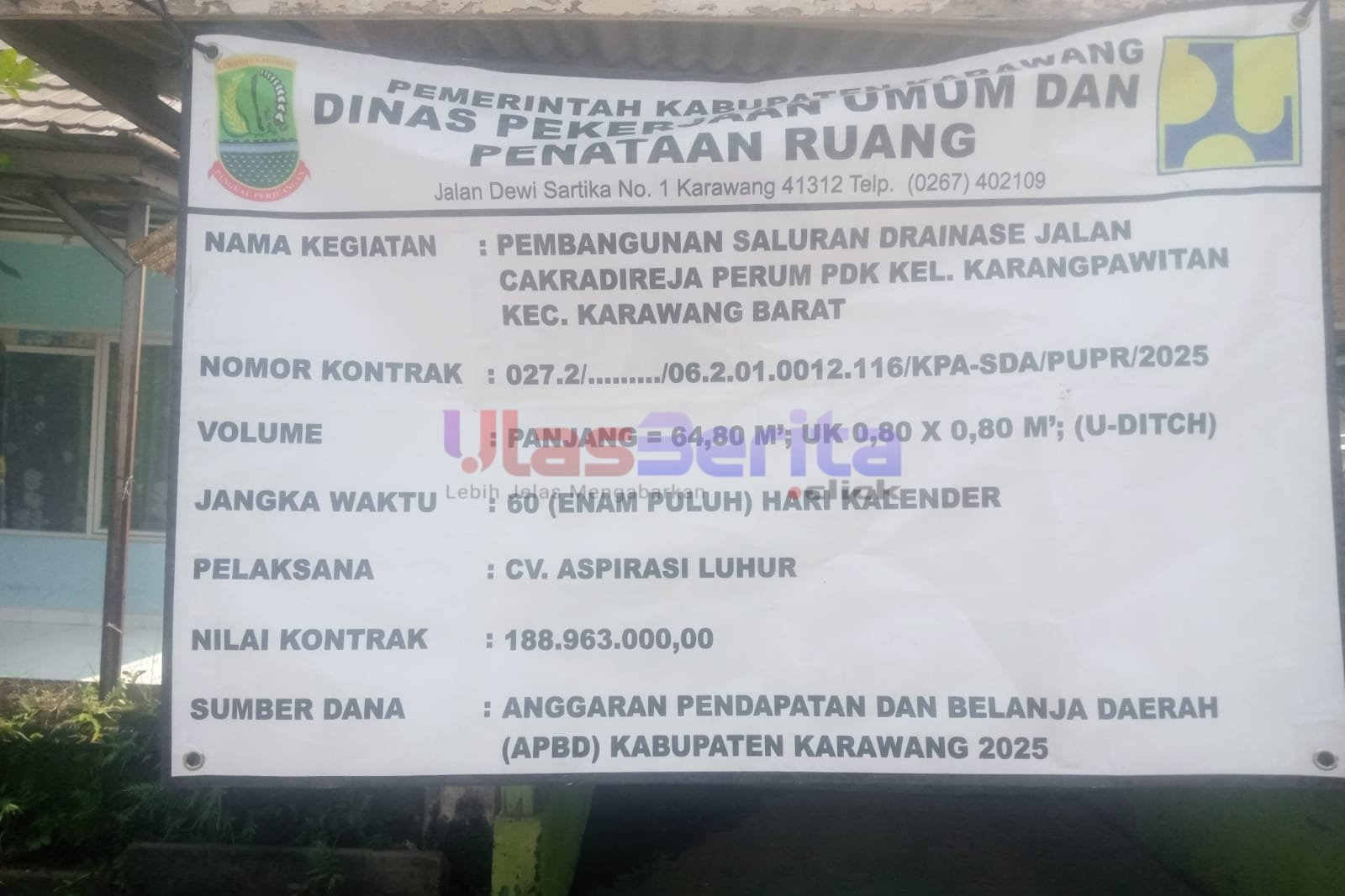 Proyek yang dikerjakan oleh CV Aspirasi Luhur ini memiliki nilai kontrak sebesar Rp188.963.000,00 dengan panjang saluran 64,80 meter dan ukuran 0,80 x 0,80 meter (U-Ditch). Dana pembangunan bersumber dari Anggaran Pendapatan dan Belanja Daerah (APBD) Kabupaten Karawang Tahun 2025.