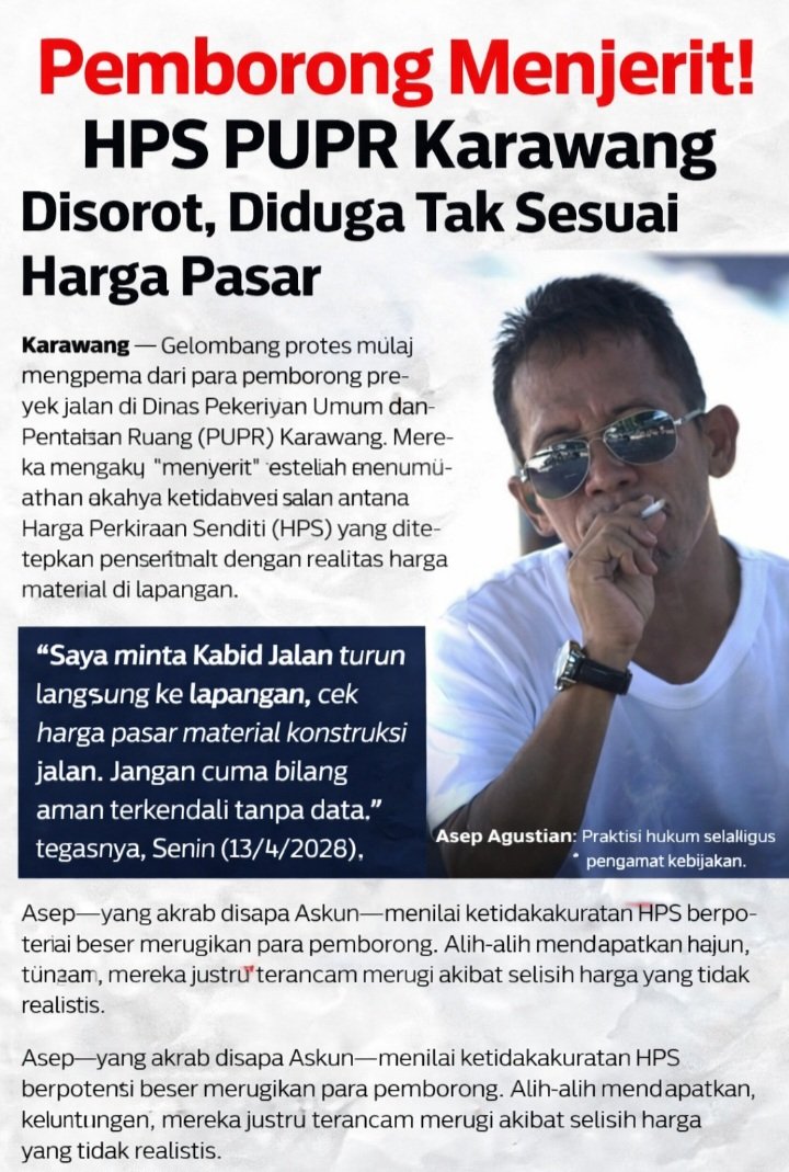 Praktisi hukum sekaligus pengamat kebijakan, Asep Agustian, angkat bicara keras. Ia menilai pihak terkait, khususnya Kabid Jalan PUPR Karawang, tidak menunjukkan profesionalitas dalam menyusun HPS yang akurat dan mutakhir.