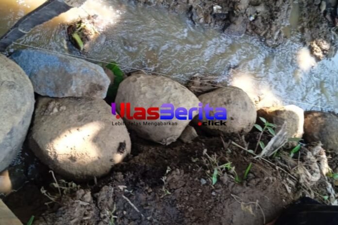 Ironisnya, pemasangan batu pondasi turap menggunakan material batu bulat yang ditemukan langsung di lokasi proyek. Lebar pasangan pondasi juga terpantau tidak sesuai spesifikasi, hanya berkisar antara 25 cm hingga 30 cm, jauh dari standar teknis konstruksi saluran air yang ideal.