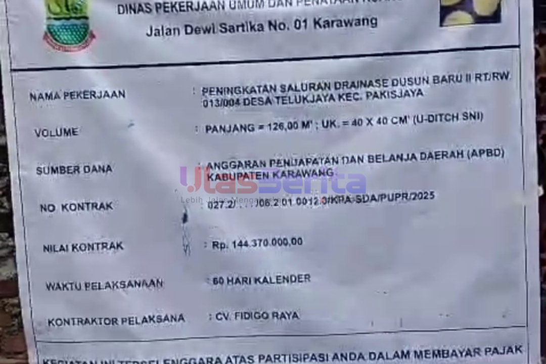 KARAWANG | ULASBERITA.CLICK | Proyek peningkatan saluran drainase senilai Rp144 juta di Desa Telukjaya, Kecamatan Pakisjaya, Karawang, menuai kecaman publik. Selain diduga dikerjakan asal-asalan, pelaksana proyek CV. Fidigo Raya justru menyiratkan kedekatan dengan pejabat daerah sebagai tameng dari kritik warga.