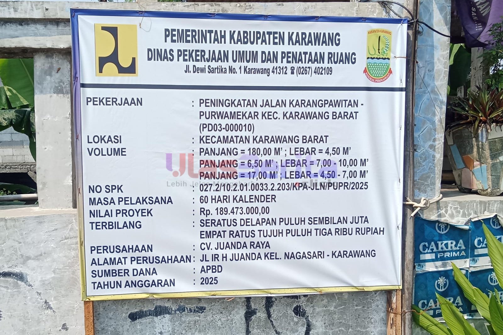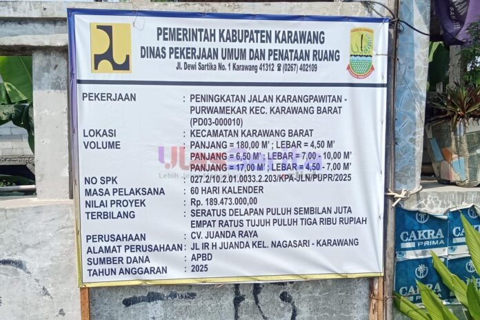 KARAWANG | ULASBERITA.CLICK | Proyek peningkatan Jalan Karangpawitan–Purwamekar yang berlokasi di Kecamatan Karawang Barat, Kabupaten Karawang, kini menjadi sorotan tajam publik. Meski telah digelontorkan anggaran dari APBD 2025 sebesar Rp189.473.000, mutu pekerjaan justru jauh dari kata layak. Kondisi jalan yang baru saja diaspal tampak mencurigakan. Permukaan pucat, lapisan tipis, dan mudah rusak.