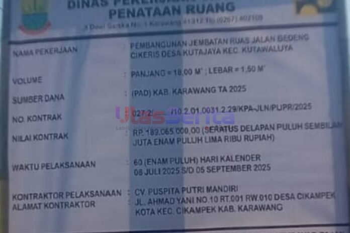 Salah satu proyek yang tengah menjadi sorotan adalah pembangunan Jembatan Bedeng di Desa Kutajaya, Kecamatan Kutawaluya, Kabupaten Karawang, Jawa Barat. Berdasarkan papan informasi proyek, pembangunan jembatan dengan panjang 18 meter dan lebar 1,5 meter ini menelan anggaran sebesar Rp189.065.000,00, bersumber dari dana APBD Karawang Tahun Anggaran 2025 (PAD). Proyek ini dilaksanakan oleh CV. Puspita Putri Mandiri dan dijadwalkan rampung dalam 60 hari kalender, mulai 8 Juli hingga 5 September 2025.