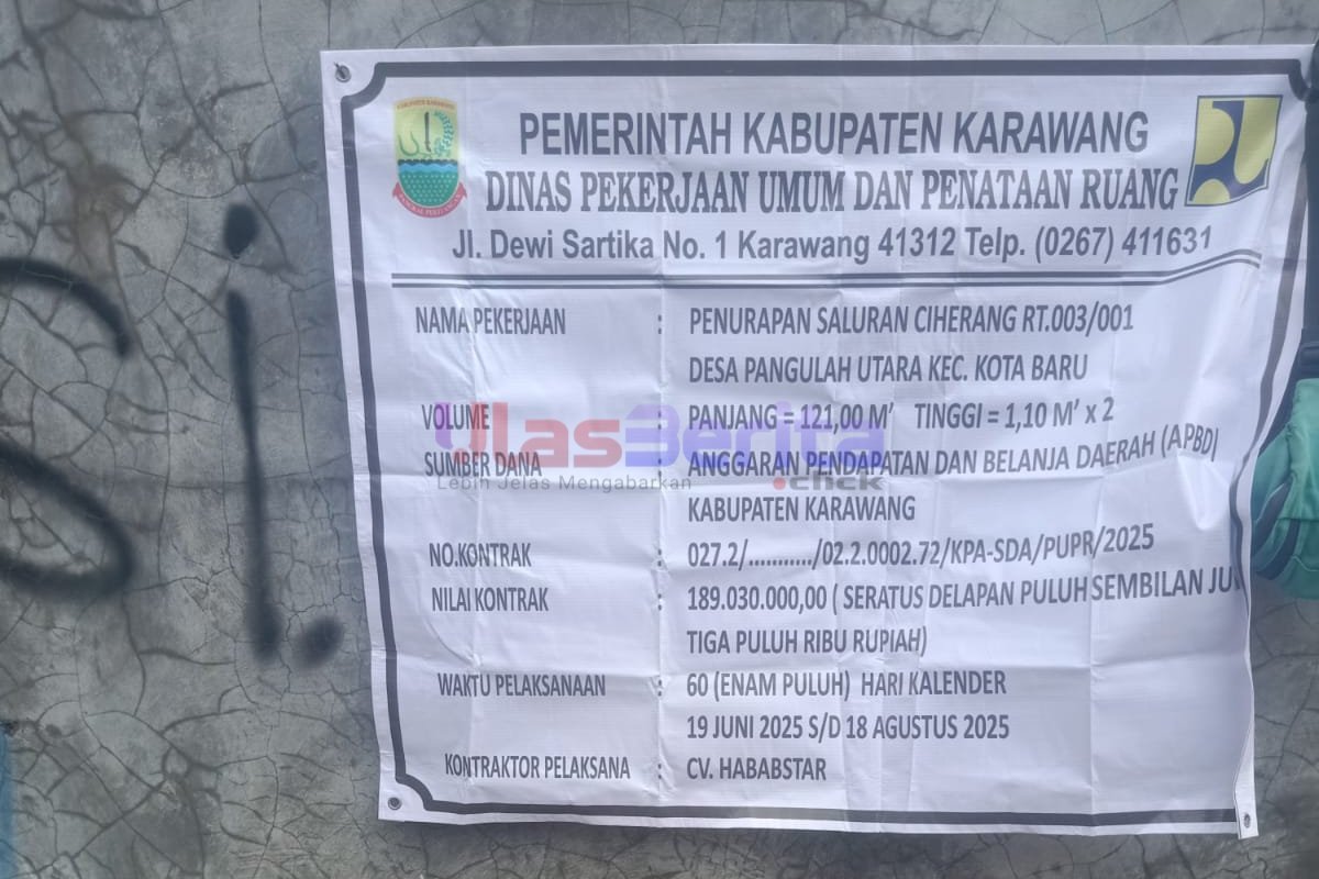 Papan proyek di lokasi memang mencantumkan nama pelaksana: CV. Hababstar, dengan waktu pelaksanaan 60 hari kalender sejak 19 Juni hingga 18 Agustus 2025. Proyek ini merupakan penurapan saluran Ciherang RT.003/001 berdasarkan kontrak No. 027.2/……/02.2.0002.7/KPA-SDA/PUPR/2025 yang dikeluarkan oleh Dinas Pekerjaan Umum dan Penataan Ruang (PUPR) Karawang.