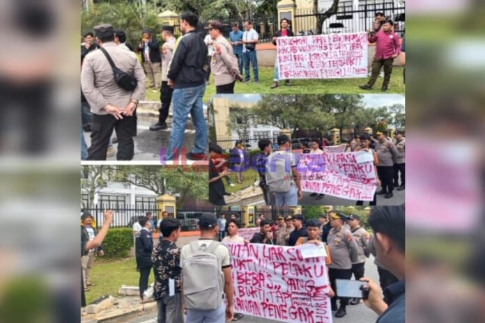 Pekanbaru – Massa dari Serikat Rakyat Anti Maladministrasi (Seram) Riau kembali menggelar Aksi Jilid III di depan Kantor Mapolda Riau, Jalan Pattimura, Pekanbaru, Jumat (19/12/2025). Aksi ini menuntut aparat penegak hukum segera menindaklanjuti dugaan praktik pungutan liar (pungli) yang dilakukan Kepala Cabang (Kacab) Wilayah III Dinas Pendidikan Provinsi Riau, Aldela Tambusai.