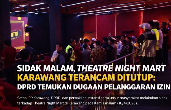 Karawang — Langkah tegas mulai terlihat. Satuan Polisi Pamong Praja (Satpol PP) Karawang bersama sejumlah instansi dan unsur masyarakat menggelar inspeksi mendadak (sidak) ke lokasi Theatre Night Mart di Jalan Tuparev, Kamis malam (16/4/2026). Hasilnya, memantik sorotan serius, bahkan berujung pada rencana penutupan sementara.