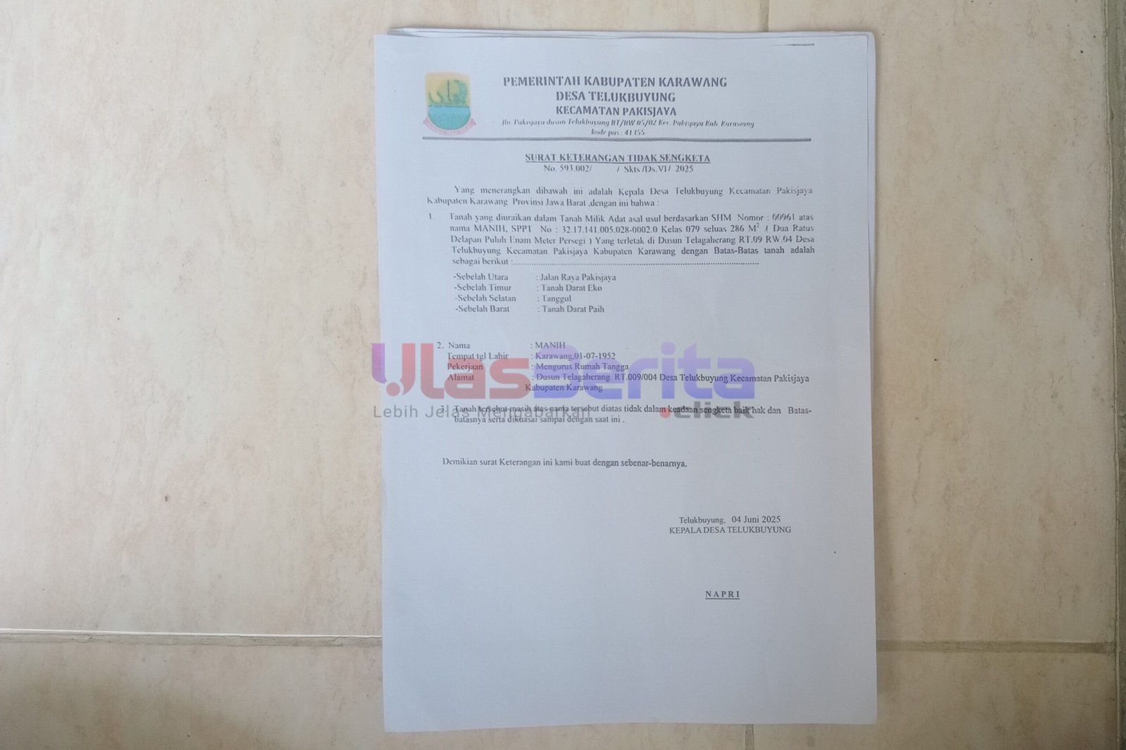 KARAWANG | ULASBERITA.CLICK | Seorang warga Desa Telukbuyung, Kecamatan Pakisjaya, Kabupaten Karawang, Jawa Barat, berinisial K, mengaku mengalami kesulitan serius dalam proses pengurusan legalitas lahan milik orang tuanya seluas 286 meter persegi. Ia menyebut bahwa hambatan tersebut diduga kuat karena adanya permintaan uang secara pribadi oleh oknum perangkat desa berinisial NH.