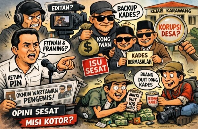 Karawang – Arah polemik “wartawan pengemis” di wilayah Kecamatan Banyusari, Kabupaten Karawang, kini berbalik tajam. Bukan sekedar kontroversi ucapan, kasus ini mengarah pada dugaan upaya sistematis untuk mendiskreditkan Persatuan Jurnalis Nusantara (PJN), bahkan disebut-sebut sebagai bagian dari skenario untuk melindungi kepala desa (kades) yang tengah terseret perkara hukum.